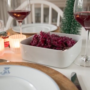 zu Weihnachten gibt es ganz viele unterschiedlichen Beilagen zum Weihnachtsessen. ob Klöße, Knödel, Salzkartoffeln, Kartoffelgratin oder oder oder.. bei den meisten Familien gibt es Rotkohl zum Weihnachtsessen. Und viele sind unsicher bei der Zubereitung und häufig gibt es nur ein Glas aufgewärmt. Dabei ist die Zubereitung denkbar einfach und lässt sich super vorbereiten. Idealerweise schon am Vortag, denn aufgewärmt schmeckt er immer noch einen Hauch besser. Wir machen unseren Rotkohl mit Apfel, Apfelsaft und Johannisbeergelee. Schon immer und er schmeckt einfach jedes Jahr wieder fantastisch. In einigen Haushalten wird der Rotkohl auch noch ein wenig mit Mehl oder Stärke angebunden. Das kann man machen. Wir verzichten da aber drauf, denn wir mögen die natürliche Flüssigkeit des Rotkohls sehr gerne.