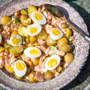- Nun die Kartoffeln und auch die gepellten Eier halbieren und auf einer Platte oder in einer Schüssel anrichten. Den Lachs darauf geben und das Dressing gleichmäßig über allem verteilen.