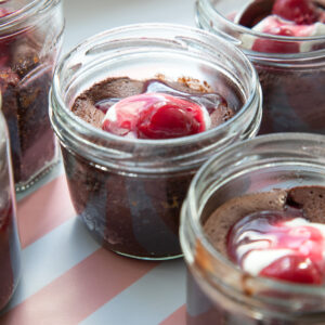- In der Zwischenzeit in einer weiteren Schüssel den Zucker und die Eier sehr schaumig schlagen. Unter ständigem Schlagen die flüssige Schokolade zugießen und unterrühren. Die Masse auf 5-6 kleine hitzebeständige Schälchen oder Gläser verteilen und jeweils einige Kirschen sanft hineindrücken.