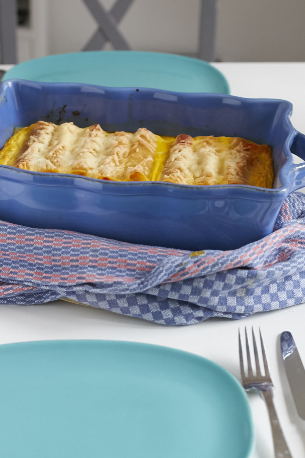 - Nun die Kürbismasse in die Cannelloni füllen und in eine gefettete Auflaufform legen.