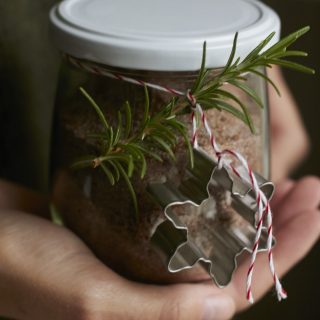 - Zucker, Lebkuchengewürz, Kakaopulver und den feinen Abrieb der Orange miteinander vermengen und in ein verschließbares Glas füllen.