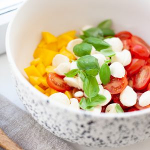 Wir sind unter der Woche ja wieder alleine mit meiner Mutter und so machen wir im Wechsel einfach immer eine Kleinigkeit ohne viel Aufwand. Da die Kinder sich ja mit einigen Lebensmittel schwer tun, hab ich jetzt einen Salat gefunden, der wirklich allen hier gut schmeckt. Ein Mango Tomaten Mozzarella Salat . Wenn ich den auf den Tisch stelle, muss ich wirklich aufpassen, dass die Schüssel nicht schon geräubert wird, bevor alle sitzen. Da verlieren sie die letzten Manieren. Aber ich kann es nachvollziehen. Daher hab ich Euch mal das Rezept aufgeschrieben. Es ist easy und lecker! Genau das richtige in home-schooling, home-kindergardening, home-office, home-überlebenstrainig Zeiten…