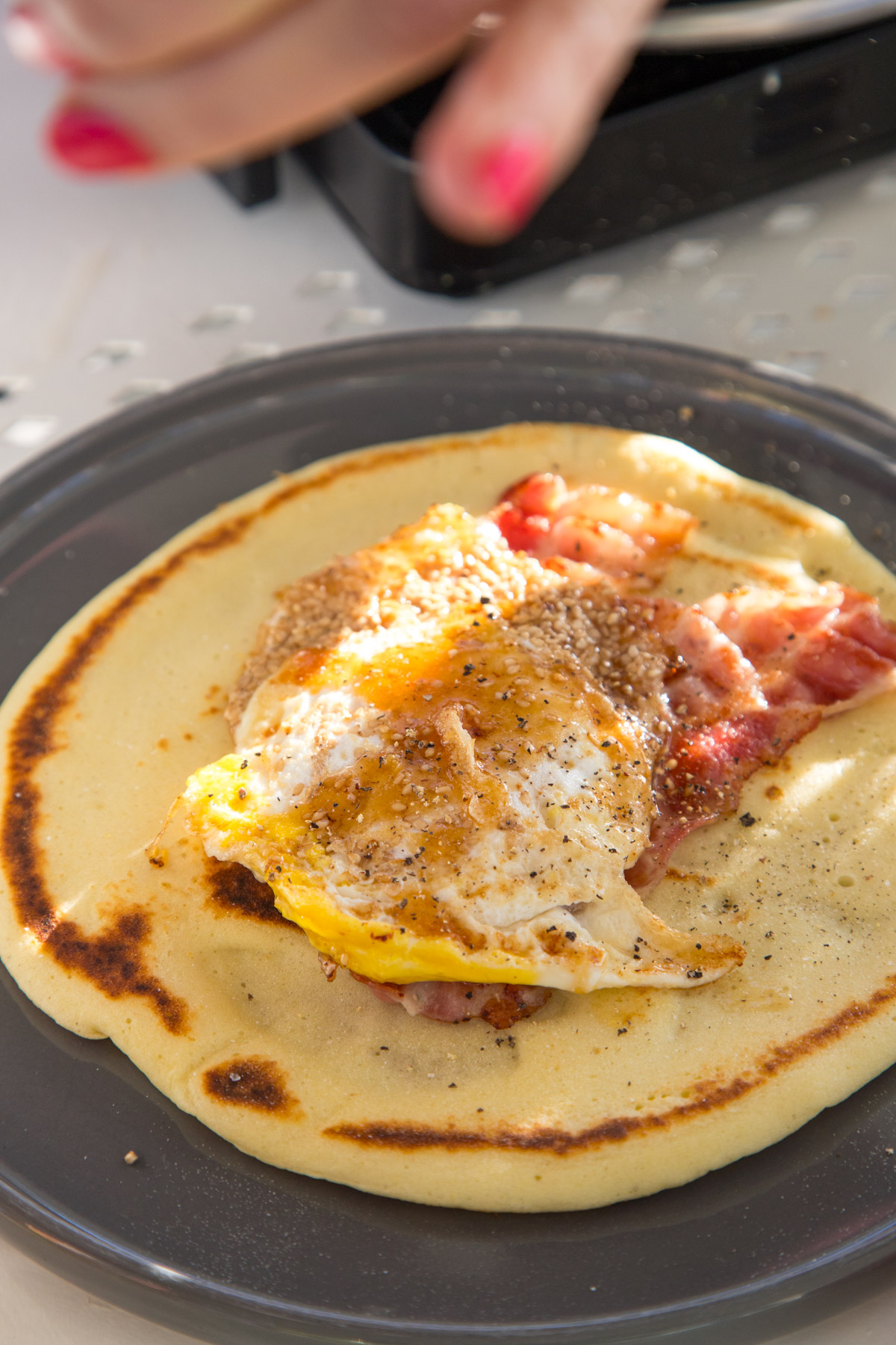Pfannkuchen mit Honig-Sesam Ei und Bacon zum Frühstück