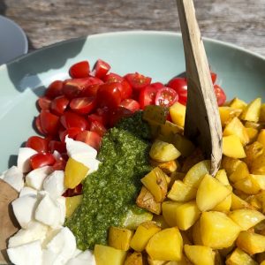 Bei Instagram hab ich meinen super leckeren schnellen Kartoffel-Tomate-Mozzarella-MIttagssalat gezeigt. Naja – mittelschnell, denn die Kartoffeln müssen im Ofen noch gegart werden. Aber das Rezept ist so easy und lecker und einfach umzusetzen. Dort findet man im Profil auch das Rezept. Viele von Euch mögen es aber auch lieber die Rezepte auszudrucken oder lieber am Rechner oder auf dem Tablett schauen. Aus dem Grund habe ich es auch noch einmal hier runter geschrieben. Die Zutatenmenge ist ganz individuell! Jeder weiß ja in etwa wieviel er isst!