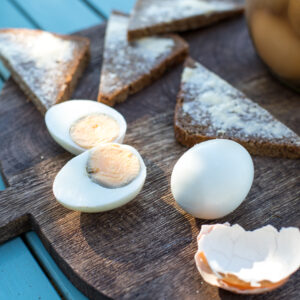 - Die Eier ca. 10 Minuten lang fest kochen, abschrecken und auf dem Tisch rund herum anschlagen. Dabei nicht zimperlich sein.